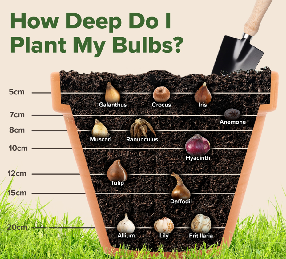 There is a simple rule of thumb when planting bulbs; Plant bulbs at twice the depth of the height of the bulb and four times their width apart. e.g 5cm tall bulbs need to be planted 10cm below the surface of the ground and 20cm apart. The following guide may help you